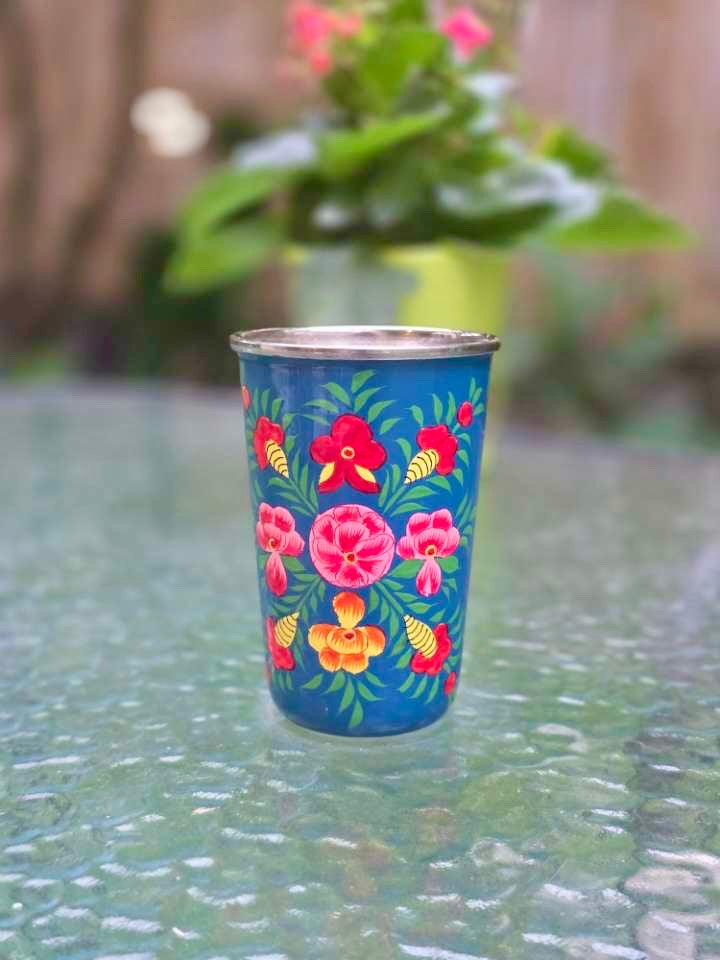 Un gobelet élégant et beau peint à la main. Ces tasses à eau en acier inoxydable présentent un design classique, inspiré des motifs florales indiens.